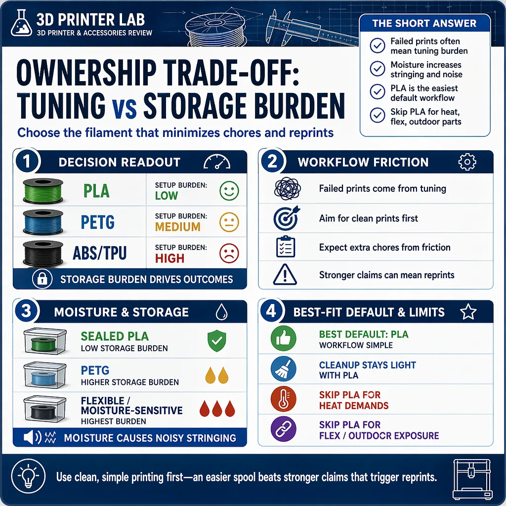 | Storage burden | Low for sealed PLA, higher for PETG, highest for flexible and moisture-sensitive materials | Moisture turns good-looking filament into noisy, stringy prints. |