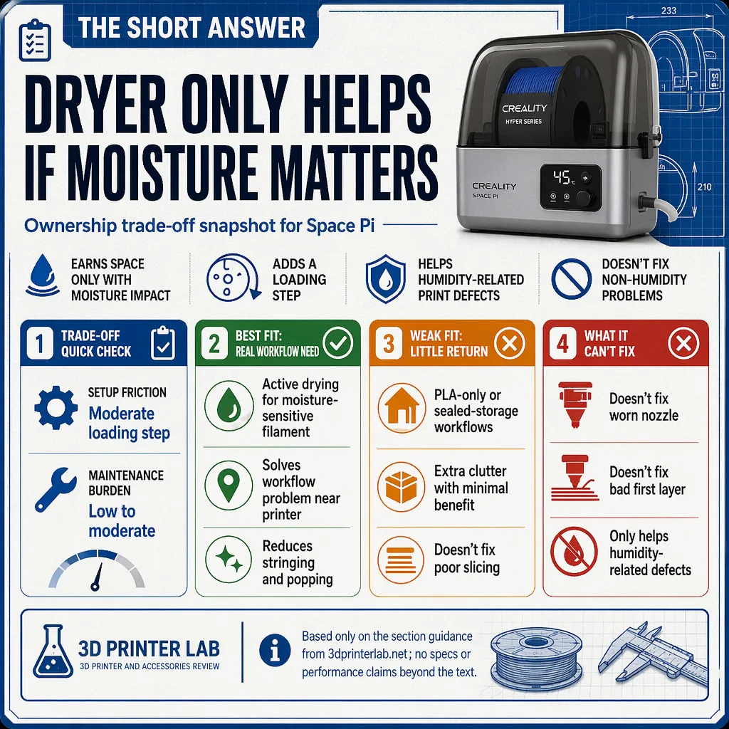 The Creality Space Pi is a sensible buy for 3D printing setups that need an active filament dryer, not another printer. The answer changes fast if your spools live in sealed bins or you print mostly PLA, because then the extra box adds clutter without enough payoff. It also changes if you run PETG, TPU, nylon, or other moisture-sensitive materials on a regular schedule, because then drying becomes part of the workflow, not a side accessory.
